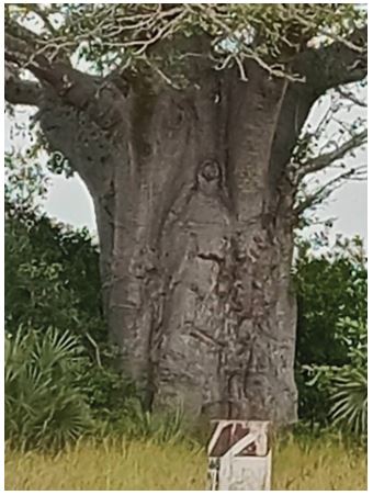Taswira hiyo iliyokita katikati ya mti mkubwa wa mbuyu, inaonekana vizuri ukiwa umbali wa mita 100 mpaka 50, lakini kadri una- vyousogelea mbuyu huo, ndivyo inavyopoteza mwonekano wake.