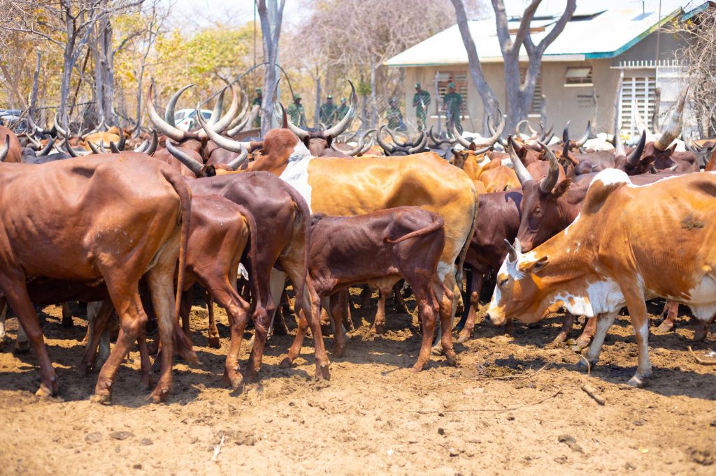 Mifugo iliyokamatwa na askari wa TANAPA baada ya kuingizwa hifadhini kinyume cha sheria ikiwa chini ya uangalizi wa askari hao.