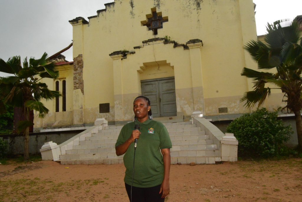 Mariam Mkonya, Mhifadhi Mkuu wa Malikale, Makumbusho ya Dkt. David Livingstone, iliyopo Ujiji, Kigoma akiwa amesimama mbele ya Kanisa Katoliki lililojengwa mwaka 1879, akielezea historia ya kanisa hilo.